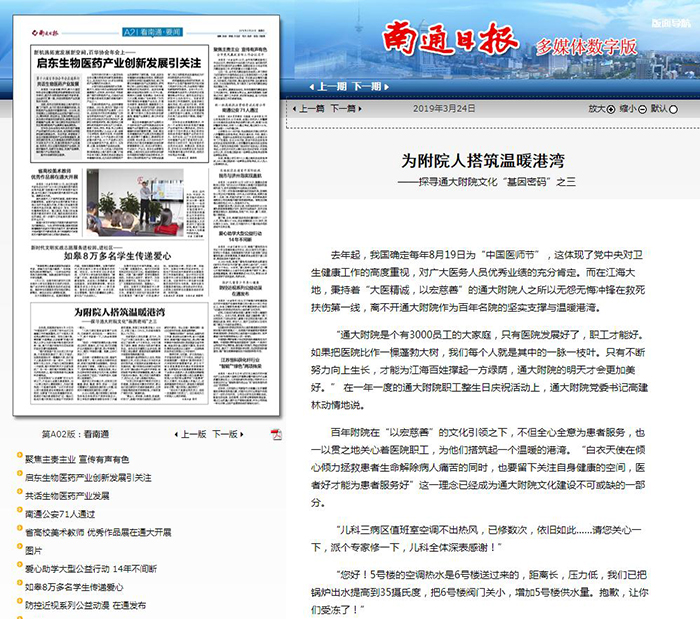 南通日报:为附院人搭筑温暖港湾——探寻通大附院文化“基因密码”之三