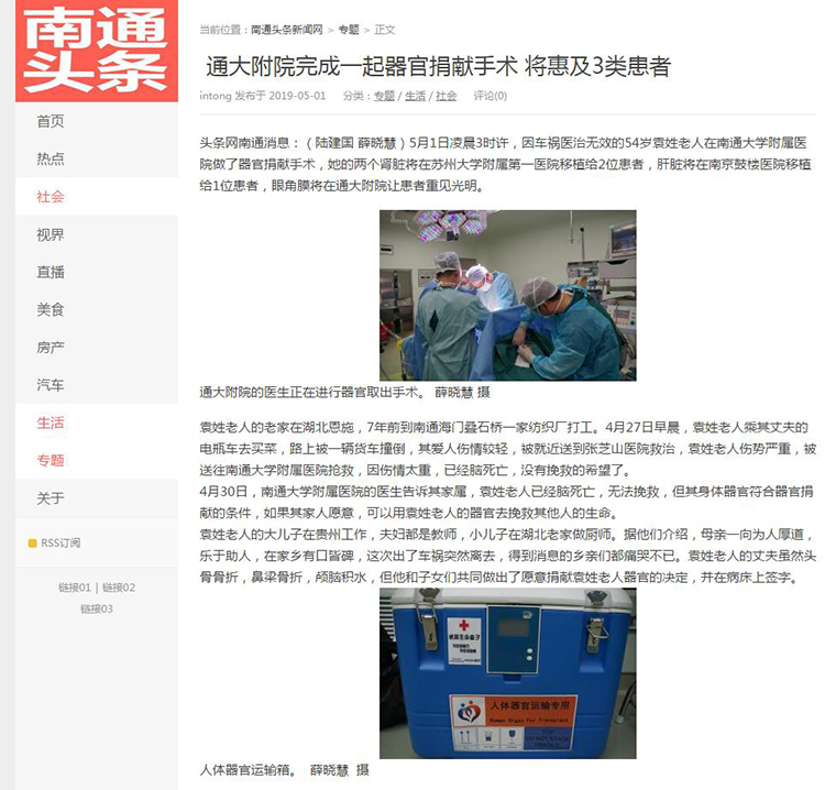 南通头条:通大附院完成一起器官捐献手术 将惠及3类患者