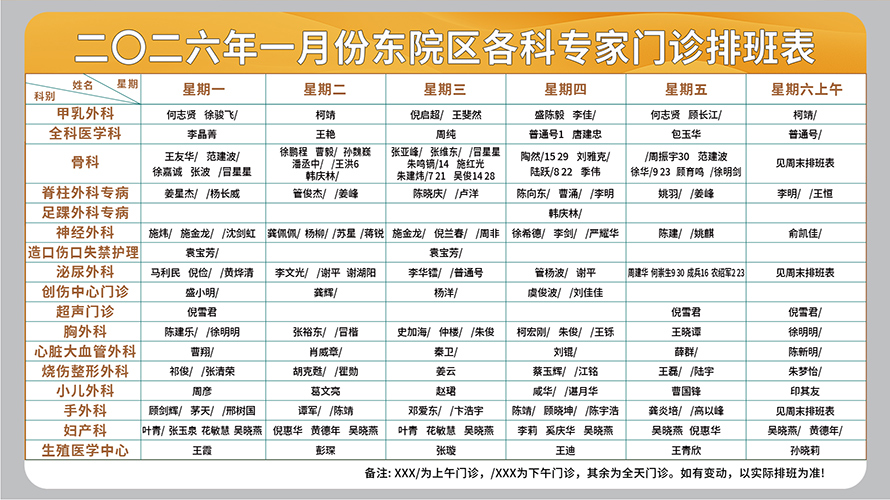 东院区周一至周六上午门诊专家排班