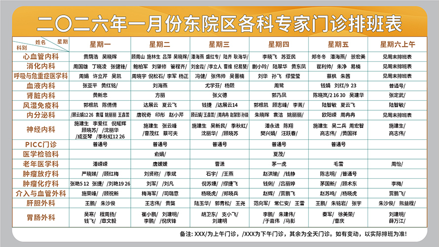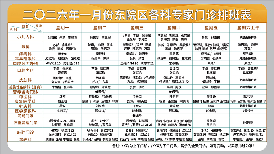 二○二六年一月份东院区门诊排班表(周一至周六上午)