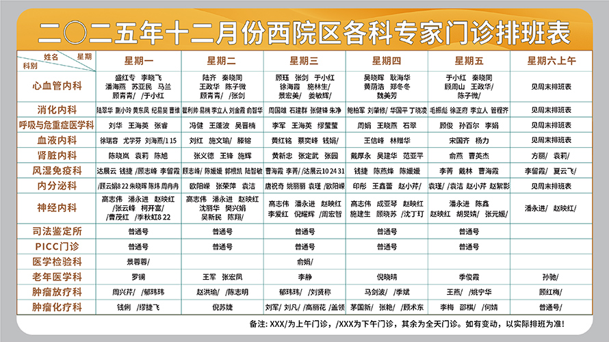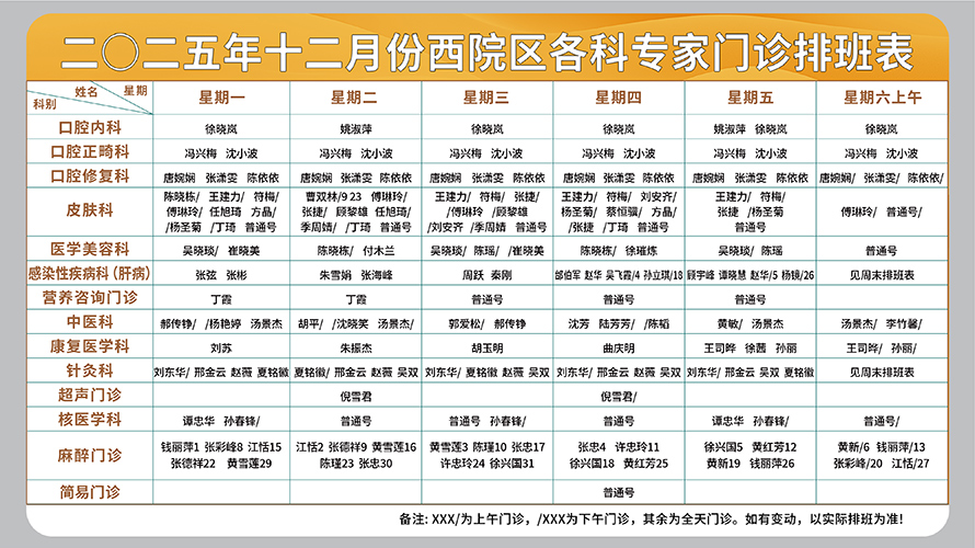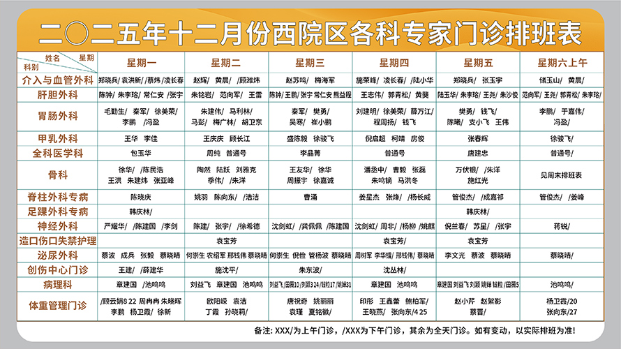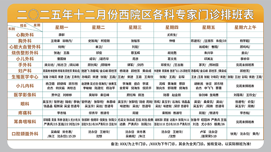 二○二五年十二月份西院区门诊排班表(周一至周六上午)