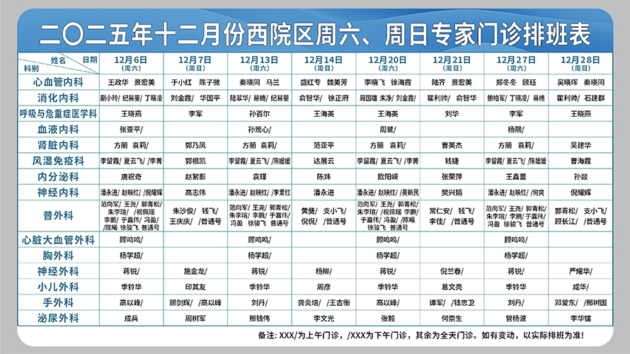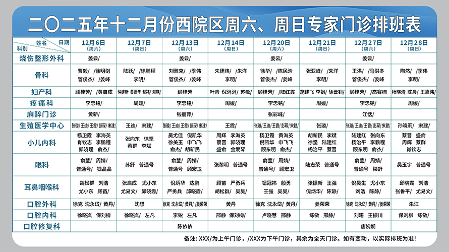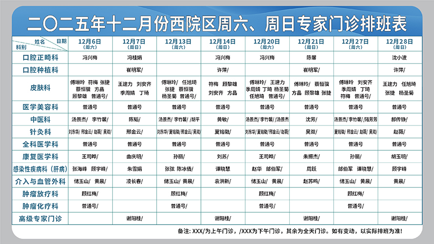 二○二五年十二月份西院区周六、周日专家门诊排班表