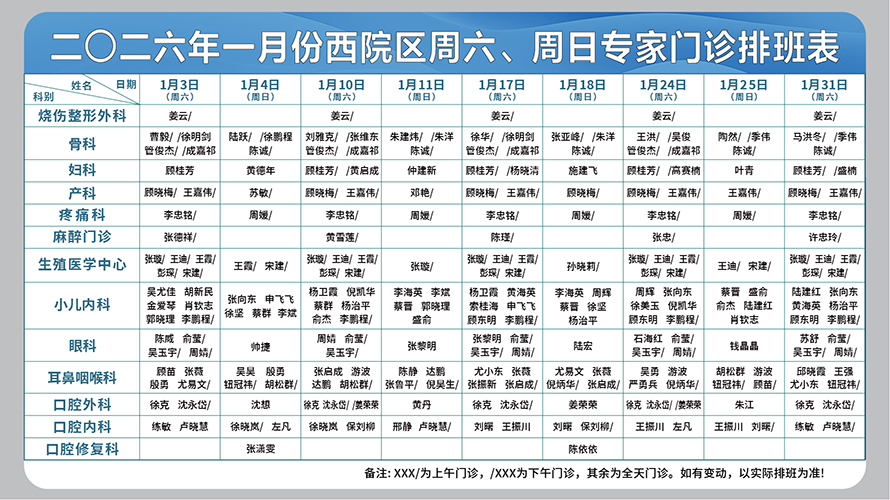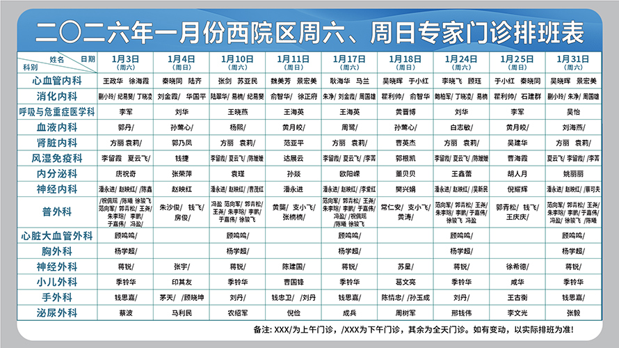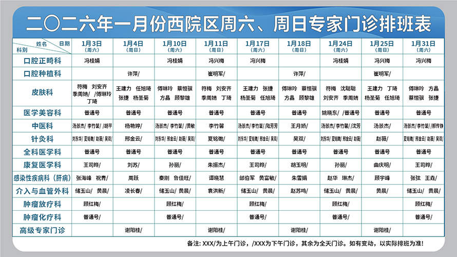 二○二六年一月份西院区周六、周日专家门诊排班表