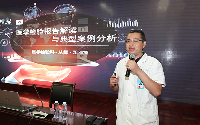 7月18日晚,我院举办今年第六期江海名医讲坛暨年轻医师三基培训,心胸外科主任尤庆生教授、医学检验科副主任丛辉作为本期培训的授课专家作精彩讲座,来自各临床、医技科室400余名年轻医师参加本次培训。 培训会上,心胸外科尤庆生教授围绕“青年医生的培养与职业规划”主题,分享了国内外医生培养概况、美国医生培训制度的优势、中国医生培养过程及青年医生职业规划等内容,他寄语年轻医师,在当前国内医师培养的模式下,要努力提高自己的职业素养,强化职业技能训练,培养成吃苦耐劳的习惯,做好科研工作,才能成为一名优秀的医生。随后,医学检验科副主任丛辉以“医学检验报告解读与典型案例分析”为题,从我院医学检验科简介、报告单解读示例、案例分析等方面,结合自己的工作体会,理论联系实际,与参会学员展开深入细致的讲解。吉 鹏