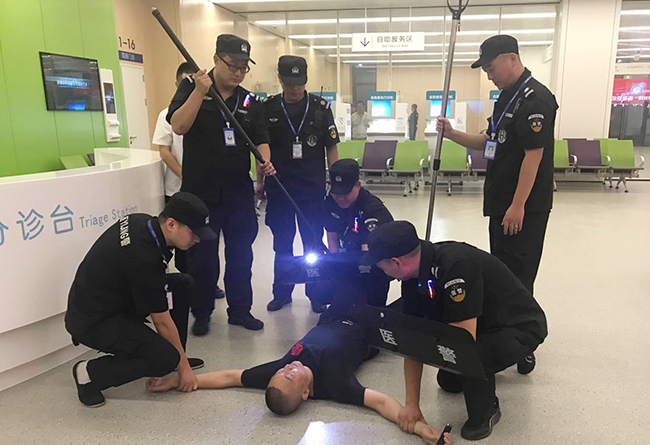 今年是新中国成立70周年,2019全国森林旅游节也即将在南通举办,又逢医院新门诊楼启用在即,为进一步增强我院医警人员应对突发事件的现场反应、协调、救治和处置能力,8月27日下午,安全保卫处联合南通市公安局巡特警支队、急诊医学科在新门诊楼大厅开展卫生应急处置培训和反恐防暴演练,急诊医学科副主任医师祁雷、南通市公安局特巡警支队杨春鉨等六名警官现场指导,安全保卫处全体人员和70余名医警人员参加了本次培训。 安保处处长戴林向大家介绍了此次活动培训内容及意义,他强调,新门诊大楼即将于9月22日启用,全体医警同志必须掌握公共场所常见意外伤害的紧急救助,同时务必做好医院的安全稳定工作,保障医护人员及患者的生命财产安全。 急诊医学科副主任医师祁雷向大家介绍了公共场所个人常见意外伤害及急救处置,并进行了心肺复苏、AED、海姆利克等急救操作进行培训。在现场实操练习中,重点对“心肺复苏术”进行了全面规范培训。大家在他的指导下依次在仿真人体上演练了胸外按压、人工呼吸等技术。 杨春鉨等六名警官现场指导开展了“突发暴力伤医袭击”事件模拟演练,进行个人极端事件处置示范及专业培训,并检查了我院处突防暴用品,还对日常医疗纠纷处置、治安突发情况应对进行了指导,并强调要及时更新、增添防护器具,日常多做训练,以便及时处置各类应急突发事件。 此次培训演练进一步提升了参训全员对卫生应急和反恐防暴的处置水平和实战能力,安保处将认真总结经验做法,深入查找薄弱环节,不断完善实战机制,为全力迎接新中国成立70周年、2019全国森林旅游节和医院新门诊楼启用提供安全保障。 倪丽云 袁爱华