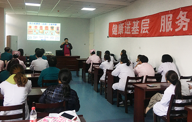 10月23日,由我院港闸全科医学中心举办的第七期“健康进基层 服务暖人心”科普教育宣传义诊活动在港闸区万福护理院举行,活动吸引了港闸区多家护理院工作人员参加。 本期活动主题为“关注老年人健康”,我院造口伤口失禁护理门诊主任护师袁宝芳进行了《关注老年人居家皮肤护理》专题讲座,她针对老年人的皮肤特点,以实际的案例与大家一起分享压力性损伤与失禁性皮炎的预防和护理,她深入浅出的讲解、图文并茂的课件以及最新的护理理念深深吸引了在场观众,大家纷纷表示受益匪浅。讲座后,袁宝芳还与急诊医学科刘佳佳、奚培培、丁俊华,心内科黄荣,眼科陈威,老年医学科张宏凤等支农骨干一起深入护理院病房,为卧床的老年病人提供诊疗咨询。丁 霞