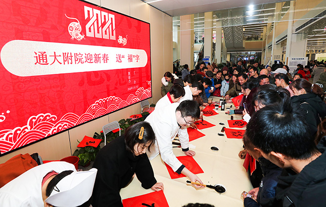 鼠年新春佳节即将来临之际,院工会书画协会、离退办联合举办迎新春送“福”字活动,在新门诊楼一大厅现场书写“福”字馈赠同仁及患者、家属。 春节是中华民族一年中最重要的节日,贴福字是家家户户迎接春节必不可少的仪式,“福”字成为春节的象征,代表着新一年的喜气。白衣天使们在护佑健康的同时,也不忘弘扬传统文化,当天用一千多幅充满墨香的福字向患者及家属表达了美好的新春祝福。南通市文化馆通大附院分馆书法班教师、南通市著名书法家张晏,我院书画协会会长黄中伟主任和书画协会的会员们,通过不同的字体写出对2020年的期待。墨汁飘香吸引了众多同仁及患者、家属前来围观喝彩,他们有序排队有请书法老师书写,一个个“福”字在妙笔下熠熠生辉,求得福字的同仁及患者、家属脸上都洋溢着幸福的笑容。志愿者吴裕美现场演奏三角钢琴,让气氛更加的温馨热烈。 此次活动既弘扬了中华传统文化,又给同仁及患者、家属献上一份独特的新年礼物,送上美好的祝福,为即将到来的新春佳节营造喜庆的氛围,丰富医院的精神文化生活,得到了大家的喜爱和高度评价。方劲松