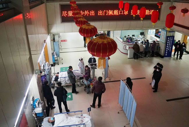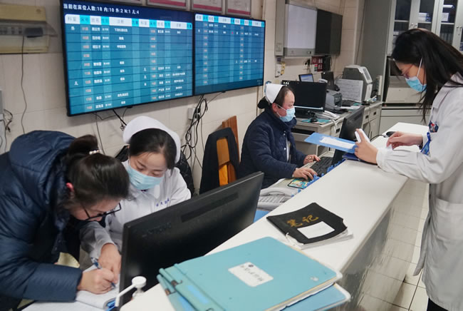 急诊大厅的电子屏幕上,“尽量减少出门、出门佩戴口罩、勤洗手勤通风”“防控疫情 人人有责”“祝全院职工新春愉快,阖家幸福!祝全市人民身体健康,万事如意!”等标语循环播出。