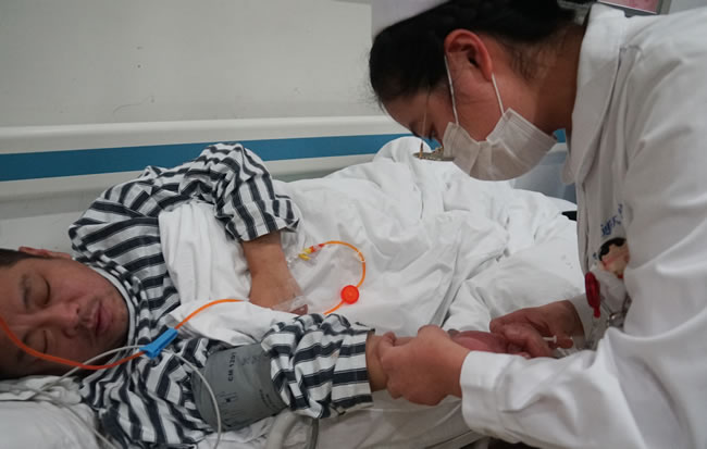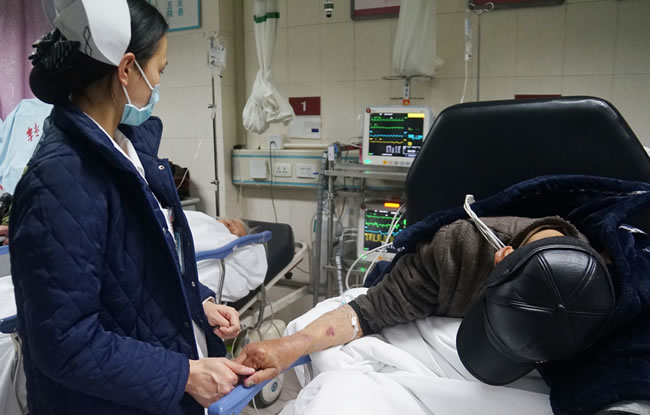 一名护士正在为一位呼吸衰竭的新病人监测生命体征,这位老人手脚冰凉,血氧饱和度测不出来,护士试图用自己的手来温暖老人的手指,以改善末梢循环。