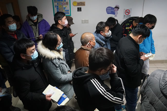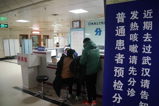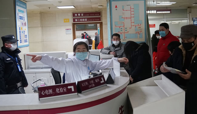 发热患者预检分诊处和普通患者预检分诊处医务人员和医警正在工作,“发热咳嗽请先分诊,近期去过武汉请告知”等标识非常醒目。