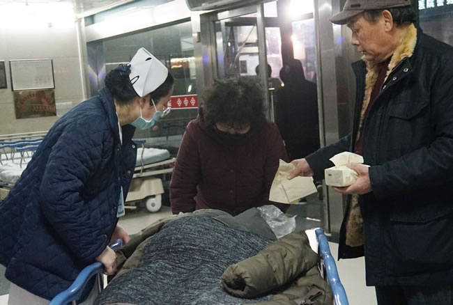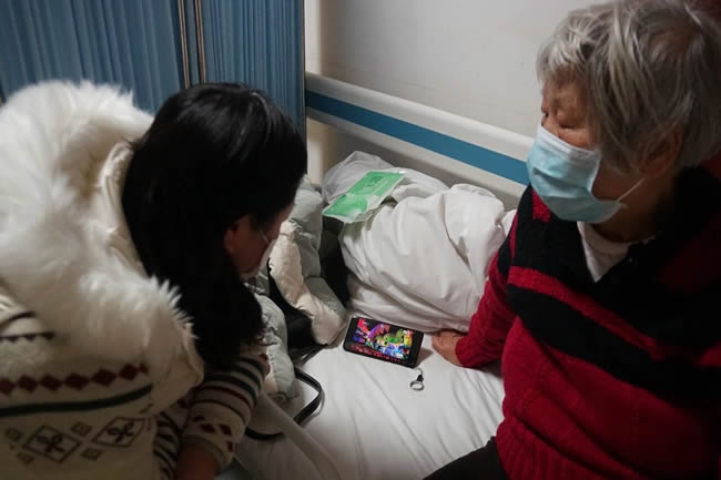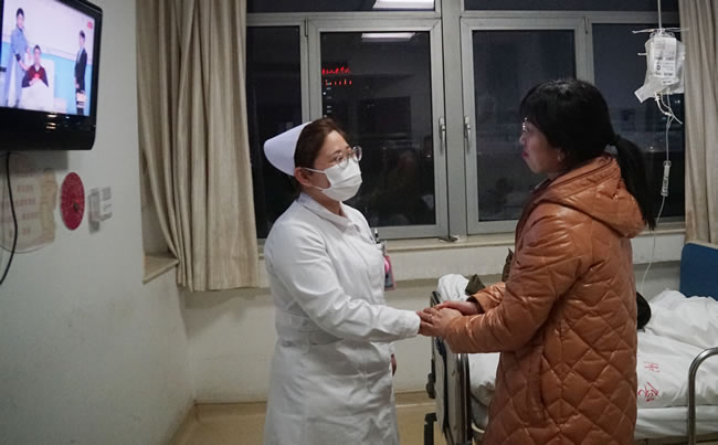 血液内科一病区护士正在为患者更换补液,正要离开,意想不到的一幕发生了,家属忽然紧紧抓住护士的手,送上新春祝福,感谢医务人员的辛勤付出,说到动情处,眼里噙满泪水。