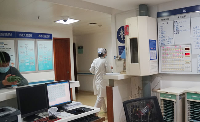 呼吸内科二病区病房已满,一览表上可见有16位重病员,信号铃响了,护士急匆匆奔向病房。