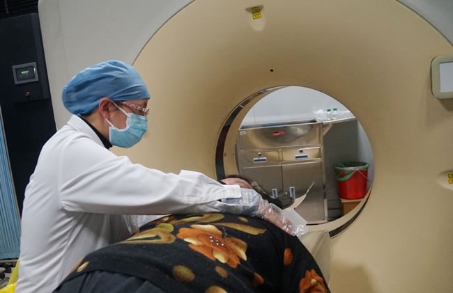 影像中心医务人员正在为患者做CT,旁边的工友说老师上班到现在一刻也没停过,门外的患者和家属也都戴着口罩,耐心等候。