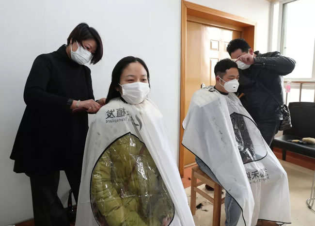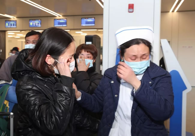 4位护士都来自重症医学科,除了张叶楠未婚,另外3人家里都有两个孩子。侯亚玲和葛洪兵都是江苏省重症医学专科护士,也都是我院重症医学科护理组组长。护师朱志红大儿子刚上幼儿园,小儿子才18个月,孩子小,平时都很粘妈妈。张叶楠父母一起来送行,从父母口中得知,张叶楠今年将要结婚。出发前,三位女队员为了方便工作,减少感染,均剪去长发。葛洪兵是位男护士,护士长称他年资高,做事沉稳,体力精力好,昨天他一接到通知即刻从老家赶来。