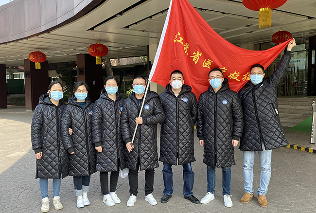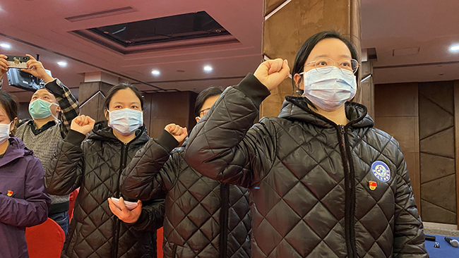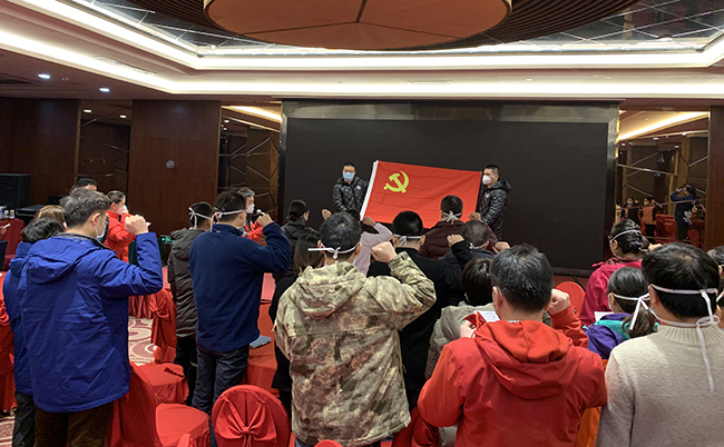 “我志愿加入中国共产党,拥护党的纲领,遵守党的章程,履行党员义务……”2月4日上午,铿锵有力的入党誓词从武汉汉阳区一家宾馆里传出,江苏省第三批医疗救援队全体党员重温入党誓词,进行出征医院前的火线宣誓,我院援湖北医疗队共产党员代表陆舒、入党积极分子葛洪兵担任旗手。 2月2日,我院7名医疗队员奔赴湖北,驰援新型冠状病毒感染肺炎重症病员的救治。7名医疗队员分别是呼吸与危重症医学科副主任医师顾俊和主治医师丁亮,重症医学科(ICU)主治医师陆舒、主管护师侯亚玲、主管护师葛洪兵、护师朱志红、护师张叶楠。其中陆舒、侯亚玲、朱志红、张叶楠是共产党员,队长顾俊在出发湖北前向党组织递交了入党申请书,葛洪兵在湖北向党组织递交了入党申请书。 2月4日,江苏省第三批援湖北医疗队在驻地举行了隆重的誓师大会。为他们即将投入的新型冠状病毒感染肺炎重症病员的救治工作加油打气,立下决心。江苏省第三批医疗队全体成员参加了大会。所有党员面对党旗共同郑重宣誓,坚持团结在党的领导下做好支援工作,保护好自己,贡献自己的一份力量。大家情绪饱满、声音坚定、踌躇满志,现场所有人都强烈感受到昂扬的斗志和必胜的信心,场面非常震撼。 我院医疗队员支援的是华中科技大学同济医学院附属同济医院中法新城院区,该院区被指定为“武汉市新型冠状病毒感染的肺炎危重病人救治定点医院”,院区开放床位600张,1月27日晚开始收治病人。江苏医疗队和北京协和医院、北京医院混合编队,共同管理新成立的重症监护病区,医生分6组,每组5人,轮流进监护病房,6小时一换班;护理分7组,每组14人左右(江苏方面),4小时一换班。 4日下午一时许,朱志红作为我院首位出征队员赶赴医院,由于重症监护病房启用后病人源源不断送来,本来已经在医院的一组医生完全不能满足需要,北京方面和江苏方面又紧急增派医疗队员赶赴现场增援,丁亮医师立即抵达病区开始工作,而在驻地未到上班时间的医生和护士则原地待命,随时准备奔赴战场增援。 薛晓慧