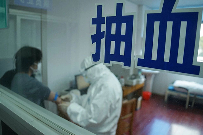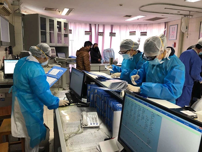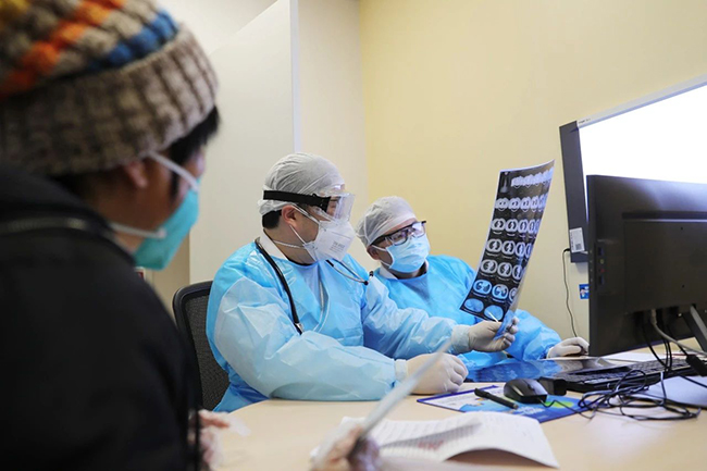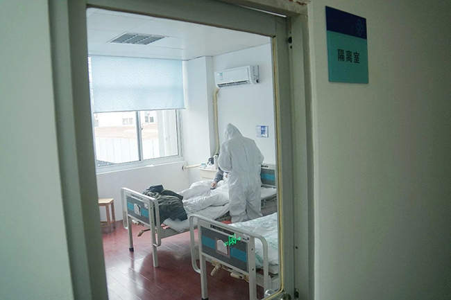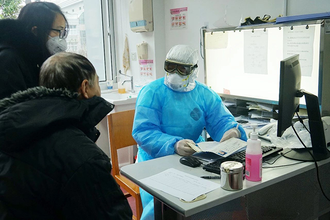 发热门诊相对于主要医疗区独立设置,医护人员身着防护服为发热患者诊治。为了节约防护用品,医护人员坚持不喝水、不上厕所,一天工作下来浑身湿透。