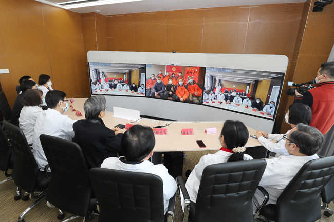 2月27日下午三点,通大附院新门诊9楼远程医疗中心再次出现亲人相聚的温馨画面。应江苏省第三批援湖北医疗队领队的要求,我院“大后方”与援湖北武汉医疗队进行视频连线。江苏省第三批援湖北医疗队领队王宁(江苏省卫健委医管中心副主任),副领队李速(江苏省卫健委医政医管处一级主任科员),我院援武汉医疗队队长顾俊率全体队员参加连线。