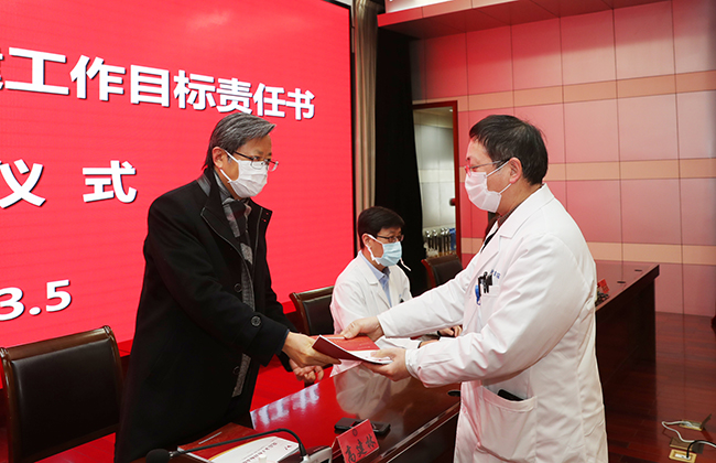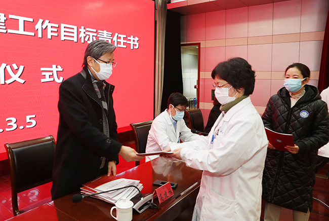 3月5日早晨,我院在影像中心4楼报告厅举行党支部工作目标责任书签订仪式,全体党总支书记、党支部书记向党委书记高建林递交了责任书。签订仪式由党委副书记、院长施炜主持。高建林,施炜,党委常务副书记彭宇飞,党委副书记、纪委书记邢晓源在主席台就坐,院领导班子其他成员参加会议。 为进一步加强我院基层党支部建设和党员队伍建设,不断提升组织力,推进党支部全面进步、全面过硬,进一步提高党建科学化水平,为医院的医疗、教学、科研和管理工作提供坚强的政治保证与组织保证,党委组织部牵头各党委职能部门,根据《中国共产党章程》《中国共产党支部工作条例(试行)》以及中央、国家卫健委、江苏省委关于加强公立医院党的建设工作的系列决策部署,按照省委教育工委、南通大学党委关于党支部建设“提质增效”三年行动计划的统一要求,结合我院《加强医院党的领导与党的建设工作实施细则(试行)》精神,制定了新一届党总支、党支部工作目标责任书。 签订仪式上,各党总支、党支部书记依次上台,向院党委书记高建林同志递交了责任书。 施炜指出,签订了责任书,既是责任,更是义务,全体党总支、党支部书记要紧紧围绕医院党建工作目标和要求,切实履职尽责,不断增强党支部的创造力、凝聚力和战斗力,推动全面从严治党向基层延伸,提高基层党建工作质量,为推动医院高质量内涵式发展提供坚强政治和组织保障。 医院专员和处级调研员,党政群团机构、(直属、附属)机构主要负责人,各党总支和党支部书记,临床医技科室、科研机构正、副主任,科护士长等近200人出席会议。 傅 轩