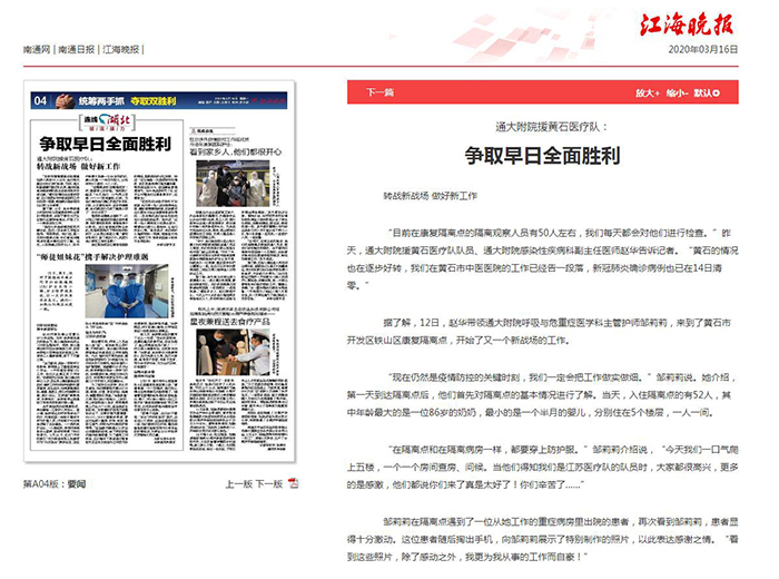 江海晚报:通大附院援黄石医疗队——转战新战场 做好新工作