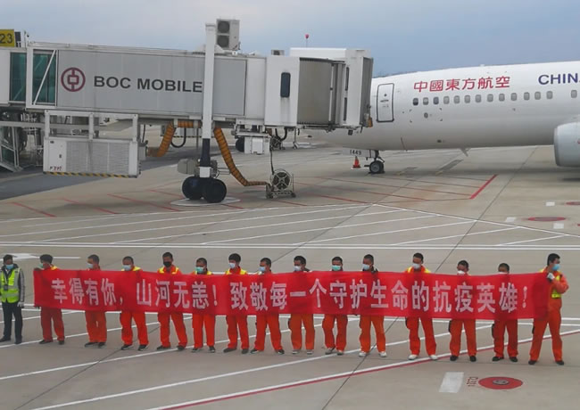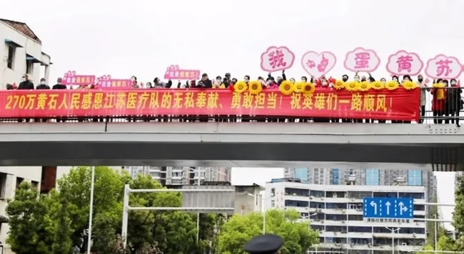 前往机场的途中,警车开道,车辆鸣笛,沿途交警列队敬礼,黄石群众站在路边,挥舞国旗,举着横幅,竖起大拇指,喊着“谢谢白衣天使”“感谢江苏!”