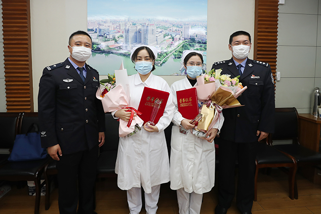 4月15日,南通市公安局党委副书记吴忠灿带队来院慰问“南通最美警嫂”胃肠外科一病区主管护师郭丽丽、老年医学科一病区护士长刘晓燕,并给她们颁发了“南通最美警嫂”的证书和奖杯。院领导高建林、邢晓源、马强、史加海参加了慰问活动。 今年2月以来,南通市公安局与市妇联共同组织开展了第三届“南通最美警嫂”推荐和评选活动,根据候选人典型事迹和组织评鉴结果,10人荣获“南通最美警嫂”称号,10人荣获“南通最美警嫂”提名奖。南通市公安局交警支队九大队中队长刘余亮的妻子、我院胃肠外科一病区主管护师郭丽丽获得“南通最美警嫂”称号,南通市公安局网安支队警务技术四级主管康海南妻子、我院老年医学科一病区护士长刘晓燕荣获“南通最美警嫂”提名奖。 院党委书记高建林对获得荣誉的两位“最美警嫂”表示祝贺。他表示,郭丽丽、刘晓燕作为全市广大公安民警家属代表,勤劳贤德、理解爱人、支持公安事业的良好形象不仅展示了公安民警家庭文明建设成果,也体现了通大附院精神文明建设、文明家风传承与建设的成果。他希望获得荣誉的“最美警嫂”珍惜荣誉,戒骄戒躁,以更加积极的姿态、更加饱满的热情投入到工作和生活中去,同时号召全院妇女职工以先进为榜样,锐意进取、奋发有为,为医院“百强梦”的实现贡献自己的力量。傅 轩