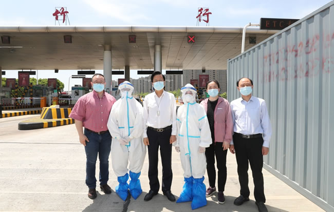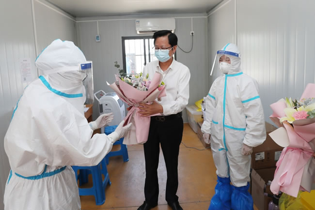 高建林向志愿者代表送上了鲜花和慰问品,详细了解了志愿者在卡口执勤的工作、休息情况,并通过志愿者代表向全体执行卡口疫情防控任务的志愿者表达了敬意和问候。他表示,疫情防控取得阶段性胜利,常态化疫情防控丝毫不能放松,卡口执勤是常态化疫情防控的重要措施。我院志愿者执勤的沈海高速竹行入口是南通的南大门,由此进入南通地区的外来人员较多,疫情防控的任务重。特别是随着夏季炎热天气的到来,志愿者身着防护服,在简陋的工作环境中出色地完成有关来通人员的抗体检测等工作,体现的正是通大附院的初心使命和担当与奉献精神。他勉励执勤的志愿者再接再厉,不辱使命,为守好南通南大门、为全市疫情防控工作交出属于通大附院人的优秀成绩单。