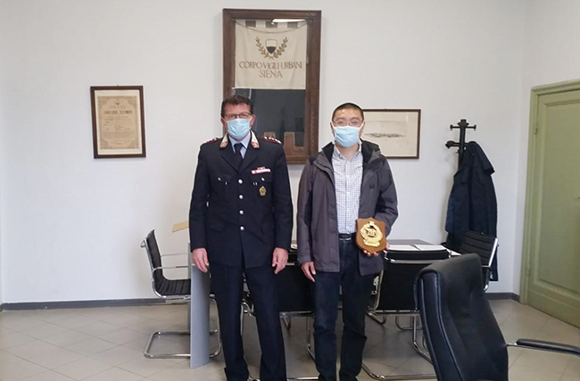 近日,意大利锡耶纳警察局长Cesare Rinaldi约见了我院医生祁雷,并授予祁雷锡耶纳警察卫士奖章。 祁雷是我院急诊科的副主任医生,在急诊一线工作近20年。2019年,祁雷获取了南京医科大学内科学(呼吸病学)博士学位后,因为表现优秀,获得了江苏省卫健委公派意大利锡耶纳大学医院进修学习的机会。2019年12月,祁雷启程前往意大利进修,进修方向是危重症体外生命支持技术。目前,他是留在意大利锡耶纳市的唯一中国医生。 在意大利疫情迅速蔓延之际,祁雷向中国驻意大利大使馆递交了请战书,毅然选择留驻锡耶纳。他这样写道:意大利疫情越来越严重,锡耶纳大学医院考虑我的安全,曾几次建议我提前回国,但我坚持留下来,有几点原因:一是我想响应祖国号召尽量不流动待在原地,二是怕现在回去可能会给国家和医院增添麻烦,三是随着交流的深入,我感受到中意人民间的真挚友谊,愿意留下来提供帮助。我郑重向大使馆提出申请,愿意跟随专家组或服从安排去意大利疫情严重城市参加疫情防控工作。 疫情期间,他先后多次将我院寄去的大部分防护物资捐赠给了意大利友人,其中包括锡耶纳警察局、锡耶纳大学医院、急诊重症新冠肺炎隔离病房所在科室、锡耶纳大学医院员工以及周边居民。 锡耶纳警察局长Cesare Rinaldi感谢祁雷为锡耶纳防控新冠肺炎疫情所做出的贡献。在授予他的锡耶纳警察奖章上,黑色盾牌是锡耶纳的城徽,母狼抚育两个孩子代表着罗马城。 这是祁雷第二次被锡耶纳政府表彰。4月7日,锡耶纳市长Luigi De Mossi专程在市政厅约见祁雷,陪同接见的还有警察局局长。在会见结束后,Luigi De Mossi市长专门在其脸书上表达对祁雷医生的感谢:“来自南通大学附属医院的祁雷医生来到市政府捐赠各种个人防护装备(口罩和手套),感谢他为防控新冠病毒所做的工作。祁先生目前居住在Siena,他的妻子居住在南通。”谢星宇