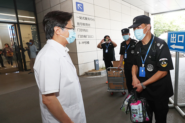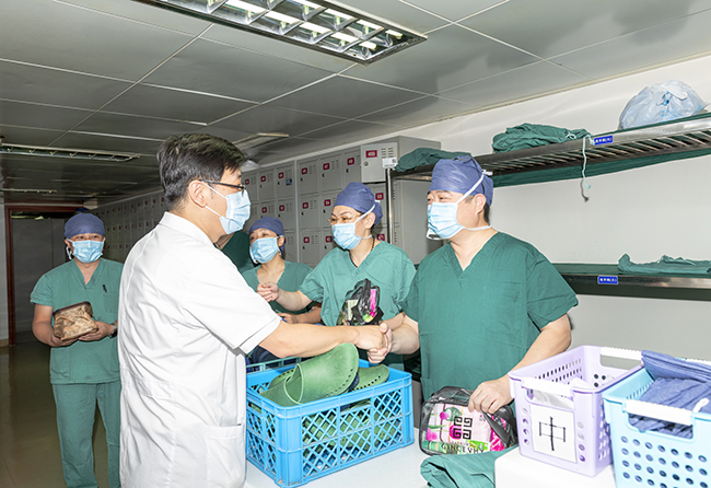 8月14日上午,院党委书记高建林,院党委副书记、院长施炜率相关部门负责人分两队到门急诊、病房、手术室、总务后勤、安全保卫等一线岗位,慰问高温中坚守岗位、辛勤劳动的医务员工代表,并给他们送上慰问品。院党委常务副书记马卫东,院党委副书记、纪委书记邢晓源率相关部门负责人赴沈海高速竹行入口处慰问我院在该交通卡口进行新冠肺炎疫情防控值守的志愿者代表。院领导对医务人员高温期间坚持高质量完成各项工作的精神表示肯定和感谢,并嘱咐大家要注意休息,保重身体。文|傅 轩 图|傅 轩 朱静仪
