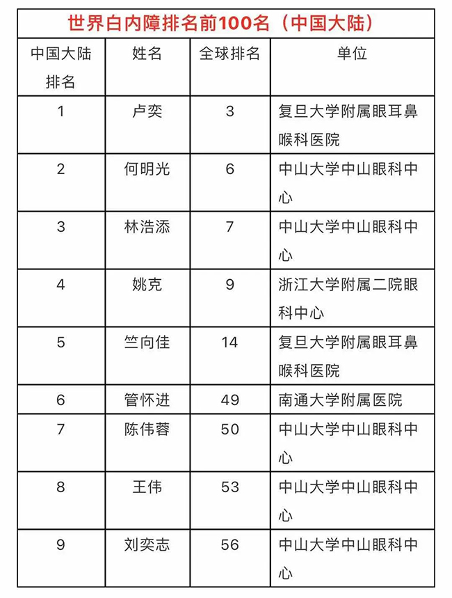管怀进教授位列全球白内障专家排名第49名