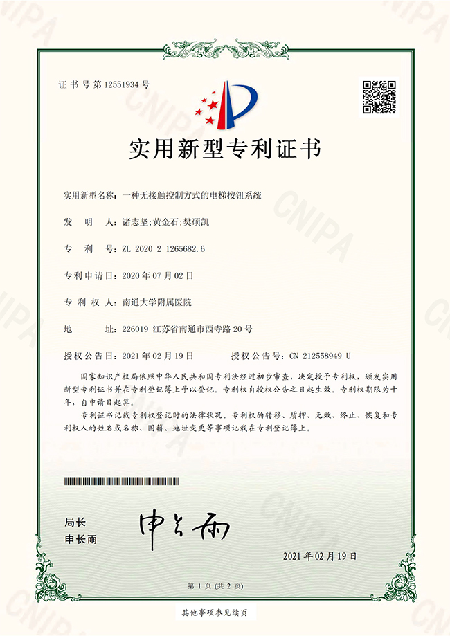 近日,我院后勤服务保障中心自主研发的无接触控制方式的电梯按钮系统正式获得国家知识产权局授予的实用新型专利证书。这也是我院后勤服务保障中心首次获得的国家专利。 我院目前有电梯75台,每日承载数万人次。由于电梯空间狭小,乘客频繁接触各层按钮,无论平时还是在疫情防控常态化的情形下,这种容易被忽视又不可避免的接触,增加了病毒细菌的传播途径,给院内感染防控带来巨大的风险。省卫健委颁发的《江苏省冬春季低风险地区新冠肺炎疫情防控指南的通知》中明确指出对公共区域高频接触物体表面,如楼梯扶手、电梯按钮等,安排专人每日进行清洁消毒的防控措施。 对此,医院后勤服务保障中心在分管领导、副院长马强的要求和指导下,开拓思路,自主研发了一套无接触式的电梯红外感应按钮。该系统可实现间隔一定空间达到登记楼层的目的,避免人手与按钮的直接接触,杜绝了病毒细菌传播的途径。按钮用电容式红外感应探头检测人体或物的感应距离,根据乘客使用电梯的习惯,选择恰当的距离,把所有检测信号传输至中央控制器,进行计时、运算逻辑分析,判断正确的输入信号,给出输出信号到电梯控制系统,操控电梯的运行。该系统还优化工艺制作,改观了原按钮的简陋与单调,运用二次发光的感官效果,使得按钮更具科技感和美观。 红外感应按钮带有纠错判别能力,同时感应距离适中,操作时更接近于人触摸时的手部运动习惯,信号动作可靠,且无需接触就能操控按钮信号,投入成本较低,目前已经在我院部分电梯上进行了安装试用近一年时间,使用方式和效果渐渐让乘客熟知和接受。后勤服务保障中心