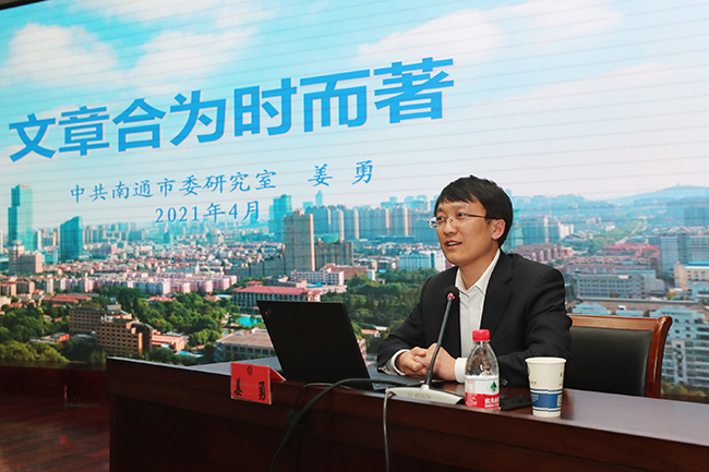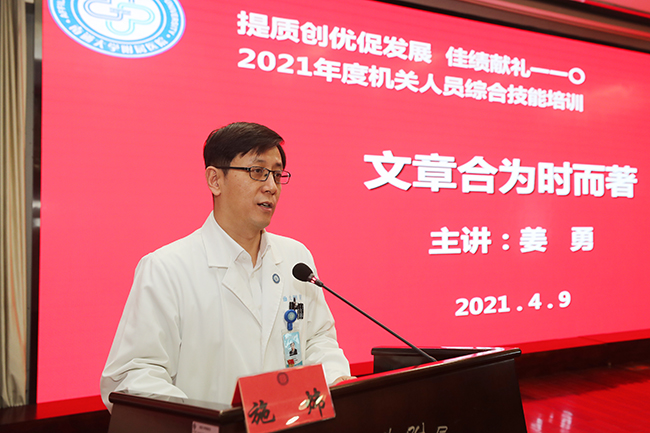 为进一步提升机关管理队伍综合素质,全面提升职能部门服务水平和管理效能,4月9日下午,医院2021年度机关人员综合技能培训开班式暨第一讲在影像中心4楼报告厅举行。院党委副书记、院长施炜主持会议。机关管理干部和工作人员近300人参加培训。 在开班仪式上,施炜介绍了举办培训班的目的、意义和日程安排。他指出,行政管理是医院内部管理体制的一个重要组成部分,在医院建设发展中发挥着不可或缺的作用,举办机关人员综合技能培训班是进一步提升医院精细化管理水平,优化服务质量和内涵的重要抓手,希望大家学有所获、学有所悟、学有所用。 南通市委研究室副主任姜勇受邀做了题为《文章合为时而著》的首讲培训。姜勇以习近平总书记讲话——“‘文章合为时而著,歌诗合为事而作’,就是要发时代之先声,在时代发展中有所作为”为主题,围绕因事定文种、因人定文风、应时定方位、应势定方略等四个方面,讲解了公文写作的格式要求、写作思路、写作技巧、立意角度、注意事项等内容。他结合多年从事公文写作的经验和工作实践,引用大量实例,通过范文对比、剖析,图文并茂地对公文写作进行了阐述。姜勇寄语大家“想得明白、写得明白、说得明白、干得明白”,令与会人员受益匪浅。 施炜指出,姜勇的讲座既有理论高度,又联系工作实际,有很强的针对性、时效性和可操作性,加深了机关工作人员对公文写作的了解,进一步厘清了公文写作思路,希望大家勤学习、善积累、多琢磨,做到学思践悟、学以致用、知行合一,在实践中不断提升公文写作和处理水平,做到“胸藏文墨虚若谷,腹有诗书气自华”。 2021年度机关人员综合技能培训,以“提质创优促发展 佳绩献礼一一〇”为主题,围绕公文写作、办公室工作、国家安全、意识形态和保密工作、公务礼仪、机关作风建设、院总值班工作等方面,邀请院内外专家指导授课,旨在提升机关工作人员综合素质和技能水平,以实际行动为医院“十四五”事业发展规划开局、110周年院庆增光添彩。叶伊湉