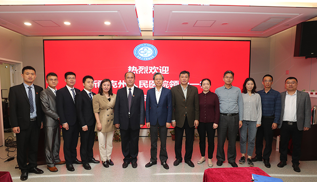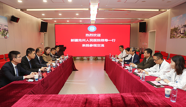 4月29日,新疆克州人民医院党委书记艾斯卡尔•白西尔率党政办等相关职能部门负责人一行6人来院交流。院党委书记高建林、党委常务副书记马卫东接待了代表团。 交流会上,高建林对克州人民医院代表团远道而来表示热烈欢迎,他从我院历史、基础建设、学科建设、人才培养等方面对代表团作了详细的情况介绍。艾斯卡尔•白西尔感谢我院长期以来高度重视援疆工作,赞赏我院援疆专家在援疆工作中的优秀表现,并对援疆干部家属表示慰问。双方共同探讨了今后的援疆方式,希望通过进一步的交流与合作,推进克州人民医院的建设,为新疆人民的健康送去福祉。 代表团一行参观了新门诊楼、生物样本库、健康与疾病管理中心。医院相关职能部门负责人参加了交流。傅 轩