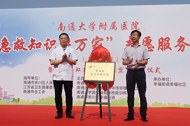 6月12日,“急救知识进万家”第200场活动南通市崇川区幸福公园举办。南通市总工会副主席季金祥,南通大学党委副书记、副校长、我院党委书记高建林,江苏省卫生健康委员会应急办主任顾帮朝出席活动并致辞。 急诊科主任黄中伟和幸福街道党工委副书记、街道办事处主任邹祥共同为“幸福虹应急救援联盟”揭牌。联盟将进一步推动完善社区综合应急预案,增强居民群众安全防范意识和应急自防自救能力。幸福社区党支部书记邢军为成员单位授旗,并赠送急救包。 本次培训内容包括:防止社区常见意外伤害的理论授课,心肺复苏、海姆利克操作法、创伤应急处置等急救技能的初步培训等。培训结束后,专家们还为现场群众提供了咨询、义诊、测血压、测血糖、测尿酸等健康服务。 400多名幸福社区居民参加了活动。本次活动由现代快报全程进行网络直播,观看人数达2.1万余人次。 “急救知识进万家”系列公益活动由江苏省卫健委、南通市总工会提供指导,由我院黄中伟劳模创新工作室、国家级实验教学示范中心南通大学临床技能训练中心共同举办,也属于江苏卫生应急自救互救素养提升工程,旨在践行“健康中国”战略,推动“健康南通”建设。自2016年5月“急诊知识进万家”志愿服务项目启动以来,劳模创新工作室的医务人员走进社区、学校、单位、工地等场所,结合各行各业人群工作特点和需求,“量身订制”志愿服务内容,专业打造“意外”急救主题。近五年来,他们开展了199场志愿活动,受益人群8万余人次。“急诊知识进万家”志愿服务项目,不再停留在“纸上谈兵”式的理论讲授,也不局限于送义诊送健康的形式。每一期活动,志愿者都会带上教学模型,在理论讲授结束后,现场示范各种紧急情况下的施救方法和流程,并让居民们亲自体验,学会自救互救的技能。此外,急诊医学科于2017年开通“南通大学附属医院急诊医学科”和“黄中伟劳模创新工作室”两个微信公众号,利用网络平台进行志愿服务活动及急救相关知识的宣传,有效提高了市民急救技能的普及率,广受市民欢迎,形成了良好的社会影响。 (文:蒋海燕 图:薛晓慧)