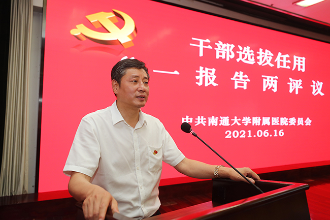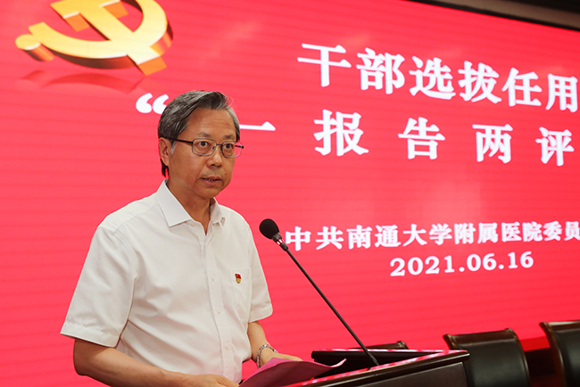6月16日,我院召开干部选拔任用“一报告两评议”会议。院党委书记高建林作2020年以来中层管理干部选拔任用工作情况报告。南通大学党委常委、党委组织部部长王卫东,副部长刘丽莉出席会议。会议由院党委常务副书记马卫东主持。 高建林在报告中指出,2020年以来,我院党委始终以习近平新时代中国特色社会主义思想为根本遵循,严格按照《党政领导干部选拔任用工作条例》要求,组织开展中层管理干部选任工作,共提拔任用业务管理干部4名、机关管理干部2名,分院领导班子成员3名,护理管理干部1名。在中层干部选任过程中,院党委坚持选贤任能、注重实绩标准不动摇,切实树立选人用人的导向性;坚持规范程序、民主决策原则不动摇,切实增强干部工作的严肃性;坚持能进能出、鼓励激励机制不动摇,切实推动干事创业的积极性。实现了优化干部队伍结构、提升干部队伍执行力、树立忠诚干净担当的选人用人导向、净化干部工作的政治生态的目标,为实现医院事业高质量发展提供了坚强的组织保证。高建林表示,院党委将继续深入贯彻《党政领导干部选拔任用条例》,始终坚持“五突出五强化”选人用人机制,鲜明树立正确导向,更加突出政治标准,不断完善知事识人体系,努力推进干部工作再上新台阶。 会议还以投票的方式对院党委2020年以来中层管理干部选拔任用工作和新提拔任用的中层干部进行了民主评议。 全体院领导,全体中层管理干部、主任助理、职工代表等300余人参加会议。 (供稿:党委组织部)