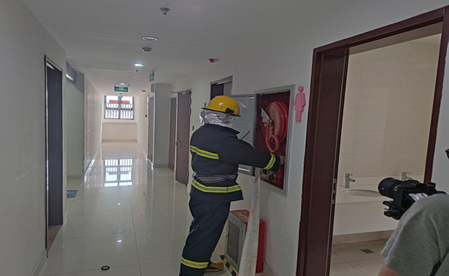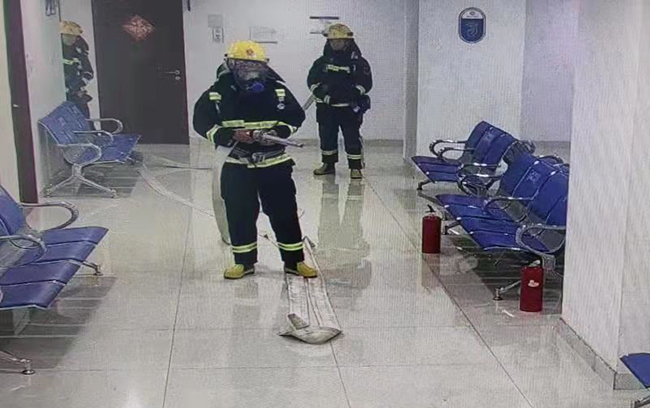16时10分:微型消防站队员使用室内、外消火栓灭火。