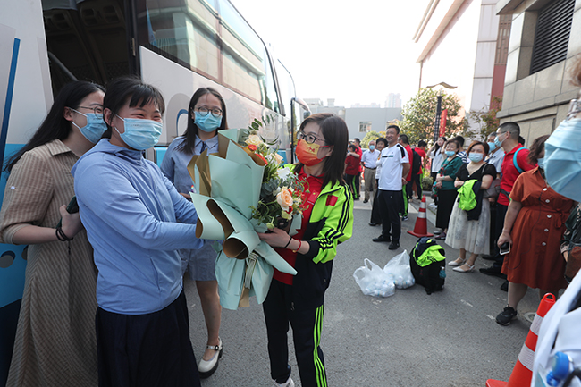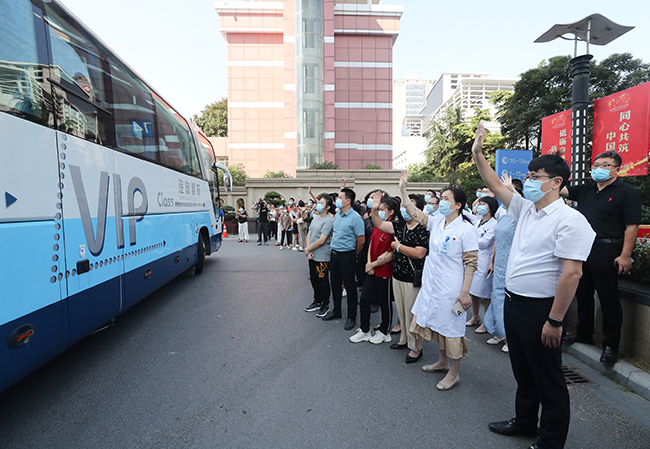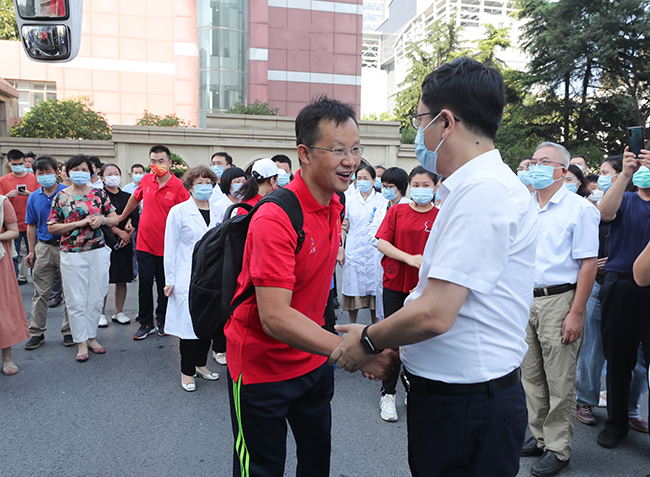 “最可爱的亲人,期盼我们下一次团圆。”欢送会上,通大附院各科室主任为队员们送上鲜花,再狠狠的看一眼,再紧紧的抱一次。
