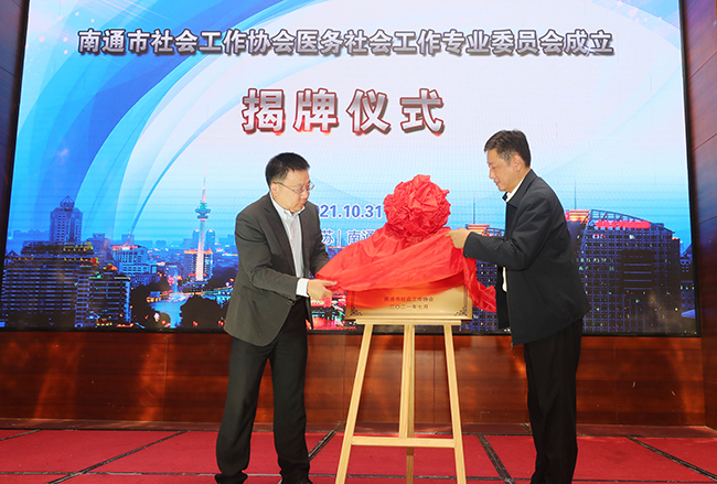 开幕式上,南通市社会工作协会会长沈风雷、医务社会工作专业委员会主任委员马卫东共同为新成立的