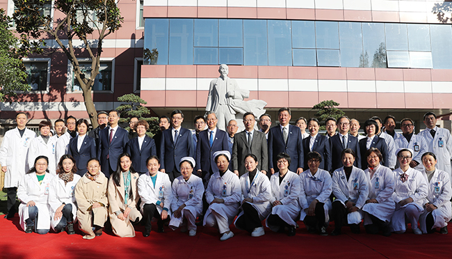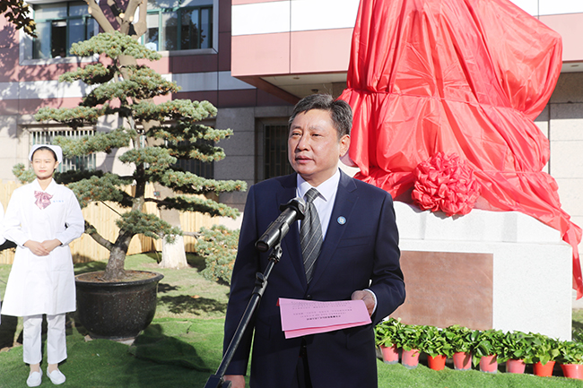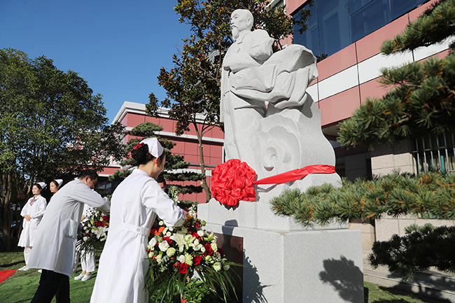 砥砺杏林之志,传承医脉精髓。今天,在建院110周年倒计时10天之际,我院在14号楼南侧花园举行张謇雕像落成仪式。活动特邀张謇曾孙、江苏省人大常委、南通謇文化科技发展有限公司董事长张慎欣先生来院。院党委书记高建林,院党委副书记、院长施炜及在通院领导出席活动。仪式由院党委常务副书记马卫东主持。 施炜在讲话中指出,张謇是我院的创办人,他一生追求实业救国的功绩光炳千秋,其崇高的人格令人景仰。在医院内矗立张謇雕像,是对先贤的崇高敬仰,是对医院110年历史的深情缅怀。他号召新时代的通大附院建设者们要致敬先贤,传承信仰,踏着新时代的节拍,一路向前,实现一个个里程碑式的飞跃。 高建林和张慎欣共同为张謇雕像揭幕。张謇雕像的落成不仅为建院110周年献上特殊生日礼,更是回溯办院历史、传承张謇精神、启航新征程的又一次文化寻根和基因赓续。青年医生和护士代表向张謇雕像敬献鲜花,以表达青年一代将谨记先贤精神,永葆新生活力,奏响青春赞歌。 张謇雕像由南通本土雕塑家陶永华设计,总高3.8米,底座高1米,人像高2.8米,重9吨。人物身着正装,手持风衣,神情坚毅,目光坚定,身后浪花翻涌,将“我踏金鳌海上来”的豪情展现得淋漓尽致。雕像正对濠河,眺望远方,身后是实验室、阶梯教室,医护员工和医学生能时时仰望先贤,激发奋进。 院职能部门、党总支负责人等参加张謇像落成仪式。