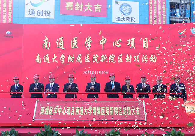 没有全民健康,就没有全面小康。把人民健康放在优先发展的战略地位,是南通市委市政府“十四五”期间为民办实事的重要工作之一。2021年11月10日,南通医学中心一期(南通大学附属医院东院区)主体封顶,这是自2020年5月8日开工后通大附院东院区建设的又一重要里程碑,标志着全体附院人“新院梦”的全面实现又进了一大步。