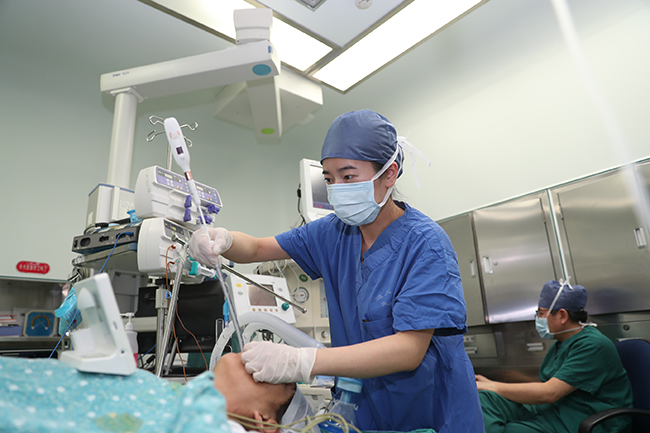 “病人手术,我们的守护是全程的” 监测血压、心率、血氧饱和度,面罩吸氧,麻醉诱导,气管插管,一气呵成。在16号手术室,麻醉医生仇利娟顺利为即将实施甲状腺手术的一名患者完成了麻醉诱导。“这才是我们工作的开始,接下来我们将进行麻醉维持、麻醉苏醒、术后镇痛等一系列的操作,对于病人的手术,我们必须全程参与、全程守护。”仇利娟说道。 都说手术医生治病,麻醉医生保命。的确,一台手术的成功与否,麻醉医生有着不可或缺的重要作用。不管是麻醉医生还是麻醉护士,工作用“繁琐”形容并不为过,常用的几十种麻醉药品要如数家珍,麻醉机、监护仪、抢救车,这些设备都要准备和调试,“地多、摊大、忙碌”是他们最真实的写照。 在综合手术室每天200台手术的高强度之下,麻醉医生、麻醉护士也是加班加点。据麻醉手术科主任黄新冲介绍,麻醉医生一直是24小时待命状态,特别是今年春节期间,每天都有10名麻醉医生在岗在位,5天时间50台急诊手术涉及到创伤、妇产科、心血管外科等,患者年龄也从1岁的小朋友到90岁的耄耋老人,“我们的麻醉团队出色地完成了为病人保驾护航的任务。”黄新冲为自己的同事们点赞。 其实不仅在手术室,麻醉医生在各个环节都发挥着重要的作用,黄新冲介绍,现在医院无痛人流、无痛胃肠镜、无痛纤维支气管镜、无痛膀胱镜及各种介入手术、操作、检查广泛开展,麻醉的顺利实施使无数病人在诊疗过程中免除了痛苦。