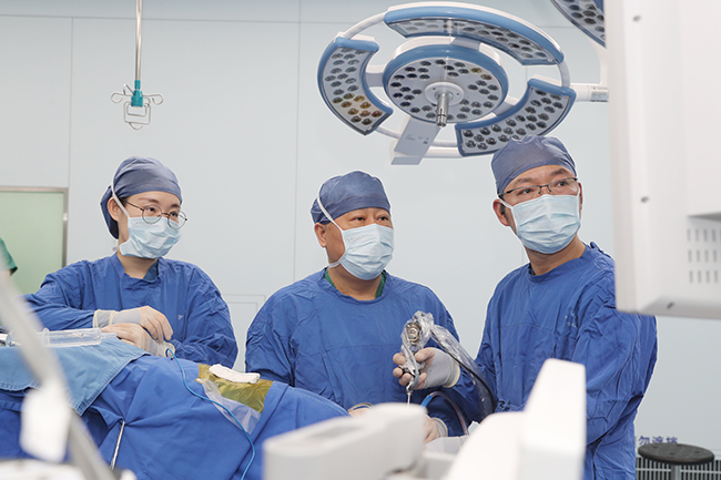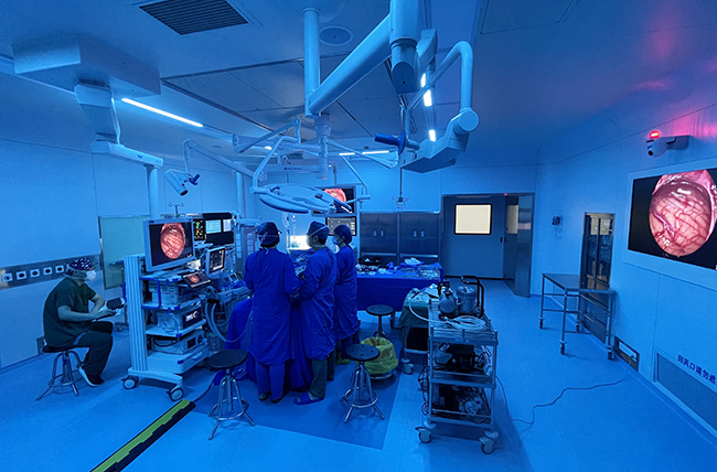 安全、高效、及时、优质 多团队保驾护航 手术日前一天,神经内镜、神经电生理、麻醉手术及神经外科病区等多个团队就如何成功完成连续八台安全、高效、及时、优质的内镜下微血管减压术召开术前讨论会,“神经内镜手术年均250台,团队积累了丰富的经验,但是每一次手术,团队都要怀着一颗敬畏的心。颅内血管、神经错综复杂,不能有丝毫马虎,这就要求我们精益求精、细致入微,对每一位病人做好预案,对可能出现的问题与困难多考虑,最大程度地规避风险,让每一位患者得到最理想的治疗效果。”施炜介绍。 2月11日,手术日当天,神经内镜团队、神经电生理团队、麻醉手术团队、供应室器械再处理团队、数字化信息团队一共26名医护人员早早到达手术室,进行细致的术前准备,2间国内一流的神经内镜一体化数字手术室环境的整理,20余种精密器械、一次性物品的准备,专用设备如电生理、4K超高清神经内镜、动力系统的调试,麻醉药物的配制,手术病人的接送,一切都在有条不紊地进行着……当天的手术还要同时为30余名研究生、规培生学习观看学习,信息团队也早早地开始调试直播信号。 7点30分,第一位面肌痉挛患者术前准备完成后,神经内镜团队开始进行手术,合理摆放体位,在头皮上切开一个三厘米左右的切口,颅骨上切开直径2厘米的骨孔,切开硬膜,置入内镜,通过内镜多方位探查压迫神经的责任血管,找到压迫的异常血管,用特质垫棉将粘在一起的血管和神经分开,充分减压。术中电生理全程监测,大大提高了手术质量和安全性,通过监测发现患者特有的波形在责任血管减压后消失,说明责任血管明确,在检查无活动性出血后,关闭颅腔,第一台手术全部完成用时2小时,手术医师、麻醉医师、手术护士协同合作,环环相扣;一台接着一台,在两台手术间来回切换,无缝衔接,繁忙却丝毫不乱。 晚上6点30分,8台手术全部完成,总用时11小时。虽然十分劳累,但整个手术团队充满了为病人解除病痛的获得感。这也是神经内镜团队在颅神经疾病方面完成的单日最高手术量,充分体现了团队的高超技术及团队间的高效默契配合。