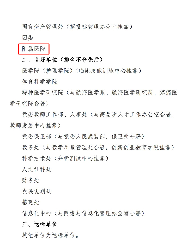 近日,南通大学公布了2021年度二级单位目标考核结果,20%的二级单位荣获优秀单位,我院位列其中,且是学校直属(附属)单位中唯一获得优秀的单位,同时也是我院继2019、2020年后连续第三年获得优秀单位。 2021年是医院建院110周年的特殊年份,是医院“十四五”规划的开局之年,也是高质量发展的关键一年,医院在医疗服务、科技创新、人才培养等方面都取得了历史性的突破。医院围绕持续推进医院高质量发展的目标,深化实施“一体两翼 强体健翼”发展战略,大力弘扬“爱国热忱、为民情怀、开放理念、无畏勇气、创新意志、担当意识、实干品质、诚信品格”的张謇办医精神,厚植“红心向党、初心为民、仁心铸魂、匠心强技、恒心继业、齐心圆梦”的核心文化,怀揣“百强梦”“新院梦”“康养梦”三大梦想,加强党的领导,完善体制机制,坚持改革发展,扎实推进医院医疗、教学、科研、管理等领域转型升级。这一年,院党委获评江苏省先进基层党组织、南通市先进基层党组织、省卫健委省属省管医院党建工作质量评比第一名,中国医院科技量值排行榜位列全国第44位、全省第4位,获江苏省教学成果一等奖,再次获评“十四五”省重点学科A类,以高质量发展的丰硕成果向医院百十华诞、向千万江海百姓献上了一份满意的答卷。 (供稿:党委宣传部)