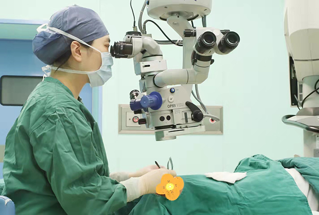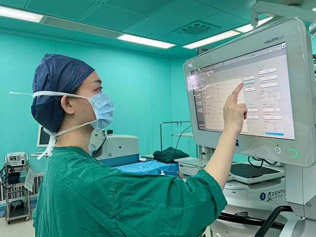 专业,追求视觉质量 “您是哪只眼睛动手术?” “左眼。” 除了常规的手术安全核查,手术室的医生护士会在术前再次确认患者的术眼。对于需要移植人工晶体的患者,会再次核对人工晶体的品种、规格和度数。 3号手术室,眼科主任管怀进教授坐在超声乳化手术系统前,双眼紧盯着显微镜,手上娴熟地操作着:麻醉、铺消毒巾、暴露手术眼、冲洗眼睛、切口、撕囊、植入人工晶体...... 一伸手或是一个眼神示意,旁边的护士立马递出需要的手术器械。管怀进经验丰富,整个手术一气呵成,一台白内障手术仅用时5分钟。 手术过程中,管怀进使用的眼科光学相干断层扫描手术显微镜和术中导航,能够全范围、多维度、无死角地进行手术,如同给医生安了“第三只眼睛”,不仅能够提高手术的精准性和安全性,辅助医生进行术中手术决策;也便于手术过程全程录像,术后分析数据、总结经验。除此之外,手术室在江苏省最早拥有LenSx眼科飞秒激光手术系统,并在全省最早实施飞秒激光辅助白内障手术。“眼科手术不仅要让患者看得见,还要让患者看得好、看得清,实现最优效果。” 不同于一般手术,眼科手术是显微手术,可操作空间小、节奏快、风险大,手术配合要求稳、准、精,容不得丝毫闪失,这对手术的医生和护士的专业素养、应急应变能力要求极高。“眼科手术室的护士上岗前需要在带教老师的指导下进行大量的理论和实践学习,并参加准入考核,考核通过才能独立配合医生完成眼科手术。”孙冬云介绍道。