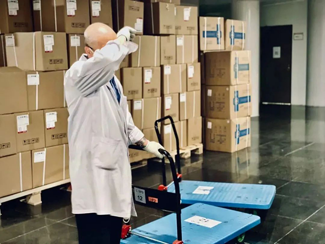 在“家蔬抵万金”的特殊时期,后勤服务保障中心想尽一切办法购进食材及被子、棉垫等生活物资,保障了留守医务人员及住院患者的吃住。作为医院的“军需”部门,医学装备处每天拨打超过100个电话联系购买防疫物资,验收、卸货、消杀、入库、分发,常常都是通宵达旦,只为“不能让我们的医护人员不带子弹去打战。”