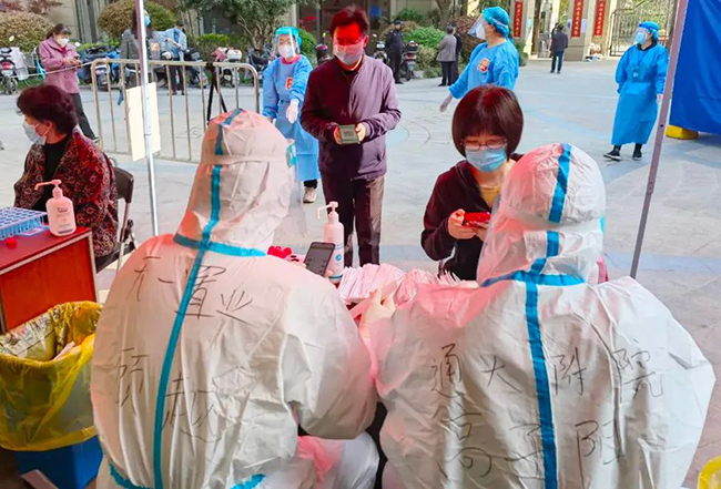 在其他的社区,还出现了通大附院党员夫妻双双变身“大白”“小蓝”为居民服务,一时成为佳话。医学影像科的高子阳与同在医院工作的爱人成艳华,一起在新城桥街道苏建名都城小区开展志愿服务。内分泌科副主任医师欧阳嵘顺利完成通州区川姜镇全镇各村两天的全员核酸采集工作后,当科室安排她备班时,她又主动投身虹桥社区丁香花园小区志愿者服务,化身“大白”。