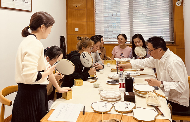 一纸墨香山水远 一缕琴声遇知音 南通青年书法家协会副主席古剑和古琴艺术梅庵琴派第四代传人刘燕红给大家带来了精彩纷呈的视听盛宴。古剑老师匠心独具,精思巧构,笔随意转,集书法、绘画于一扇,同事们在悠悠琴声中驻足观看,挑选自己中意的扇子,沉浸在文人墨客的高雅氛围中。