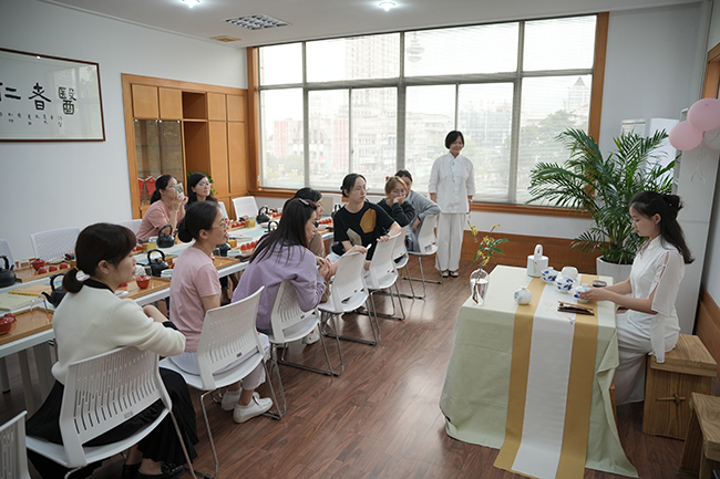 一览濠河仲秋色 一盏清茗酬亲朋 茶艺体验邀请南通市茶文化研究会会长郭树红老师以及团队,她们为医护人员一一地介绍茶器,一边讲解一边展示茶道艺术。大家在沏茶、赏茶、闻茶、交换饮茶的过程中学习了泡茶的要领,也感受到了传统文化的魅力。在4楼的活动室可以俯瞰濠河美景,缕缕茶香也融入浓浓的秋色之中。