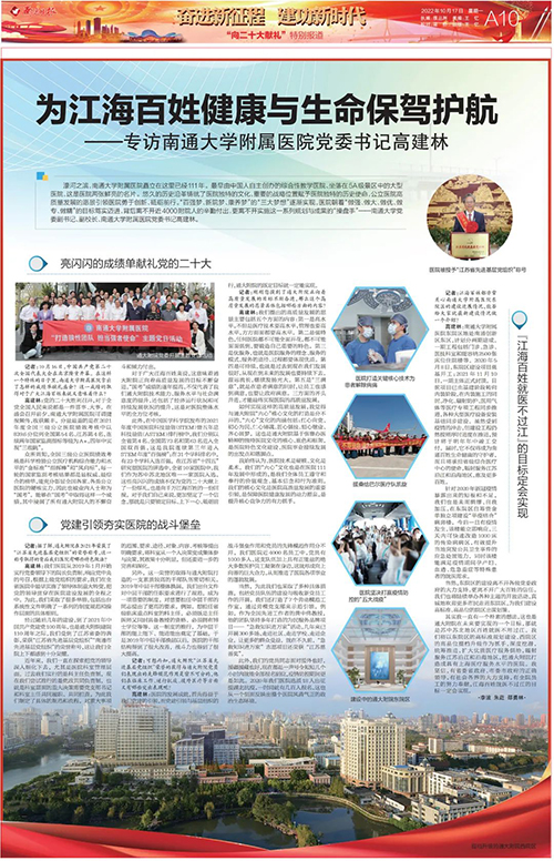 记者:10月16日,中国共产党第二十次全国代表大会在北京隆重开幕。在这样一个特殊的日子里,南通大学附属医院拿出了怎样的成绩单献礼盛会?这一成绩的取得对于广大江海百姓来说又意味着什么?