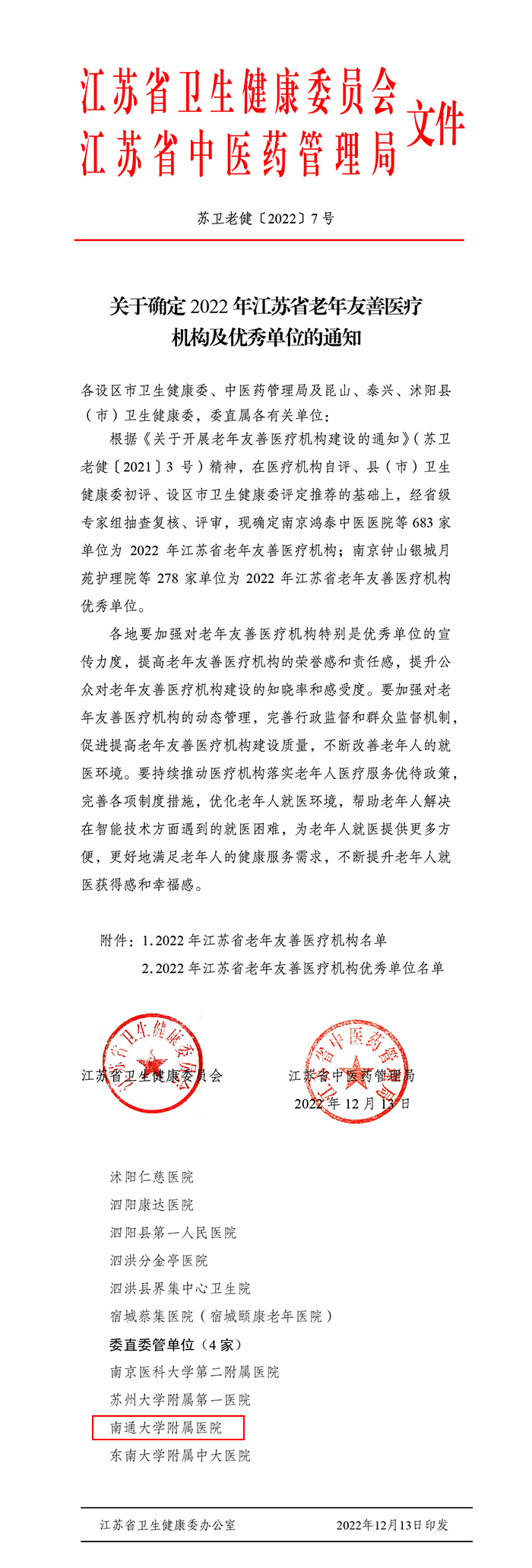| 我院获评2022年江苏省老年友善医疗机构优秀单位 |