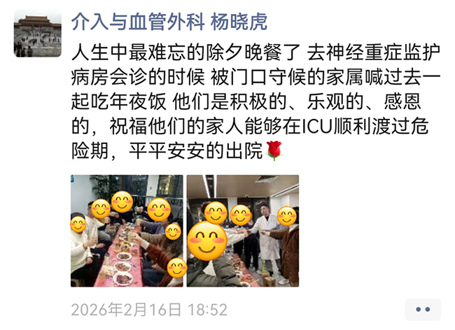 除夕,几位患者家属因守护亲人无法回家过年,在病房外相伴,一起吃着一顿特殊的年夜饭。看到前来会诊的医生,家属们主动热情邀请一起吃口热饭,医生因会诊工作紧急未能停留,却被这份朴素善意深深温暖,与大家拍下暖心合影。
